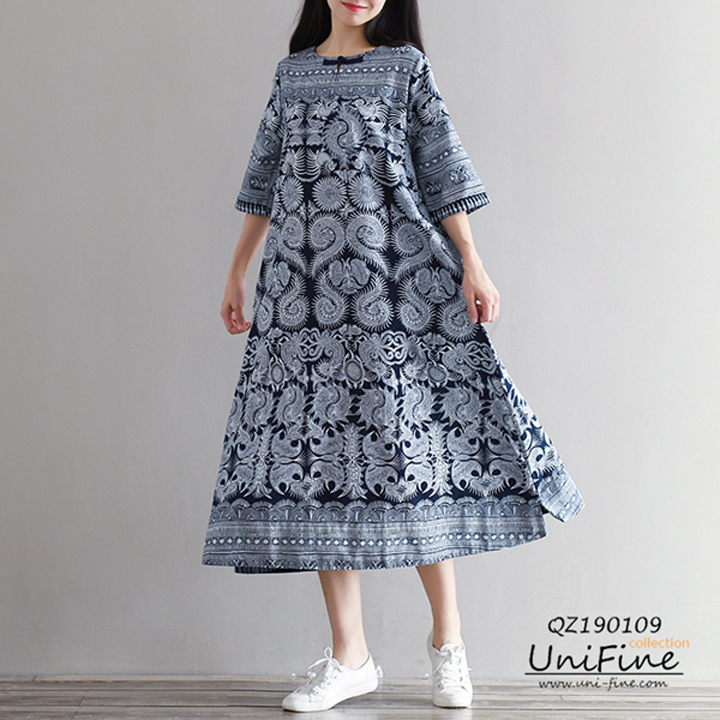 Đầm cổ thuyền tay lửng dáng xòe rộng họa tiết lạ mắt