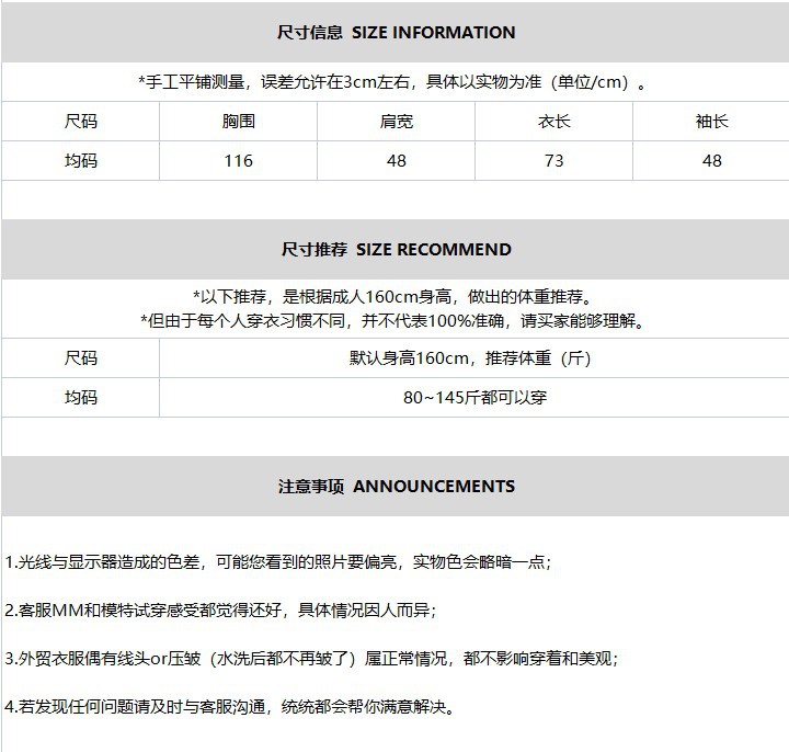-Freesize: Ngực 116cm, Dài áo 73cm, Vai áo 48cm.